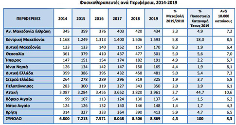 Ο δείκτης συγκέντρωσης φυσικοθεραπευτών ανά 10.000 κατοίκους κατά το 2019 είναι 8,3. Οι μεγαλύτερες τιμές παρουσιάζονται στην περιφέρεια Αττικής (10,6) και Κεντρικής Μακεδονίας (8,5) και η μικρότερη στην περιφέρεια του Νοτίου Αιγαίου (4,3). Ο μεγαλύτερος αριθμός φυσικοθεραπευτών παρατηρείται στην περιφέρεια Αττικής (44,7%), με δεύτερη την περιφέρεια Κεντρικής Μακεδονίας (18%). Ακολουθούν η Θεσσαλία (5,6%), και η Δυτική Ελλάδα (5,4%). Όλες οι άλλες περιφέρειες παρουσιάζουν ποσοστά κάτω του 5%.